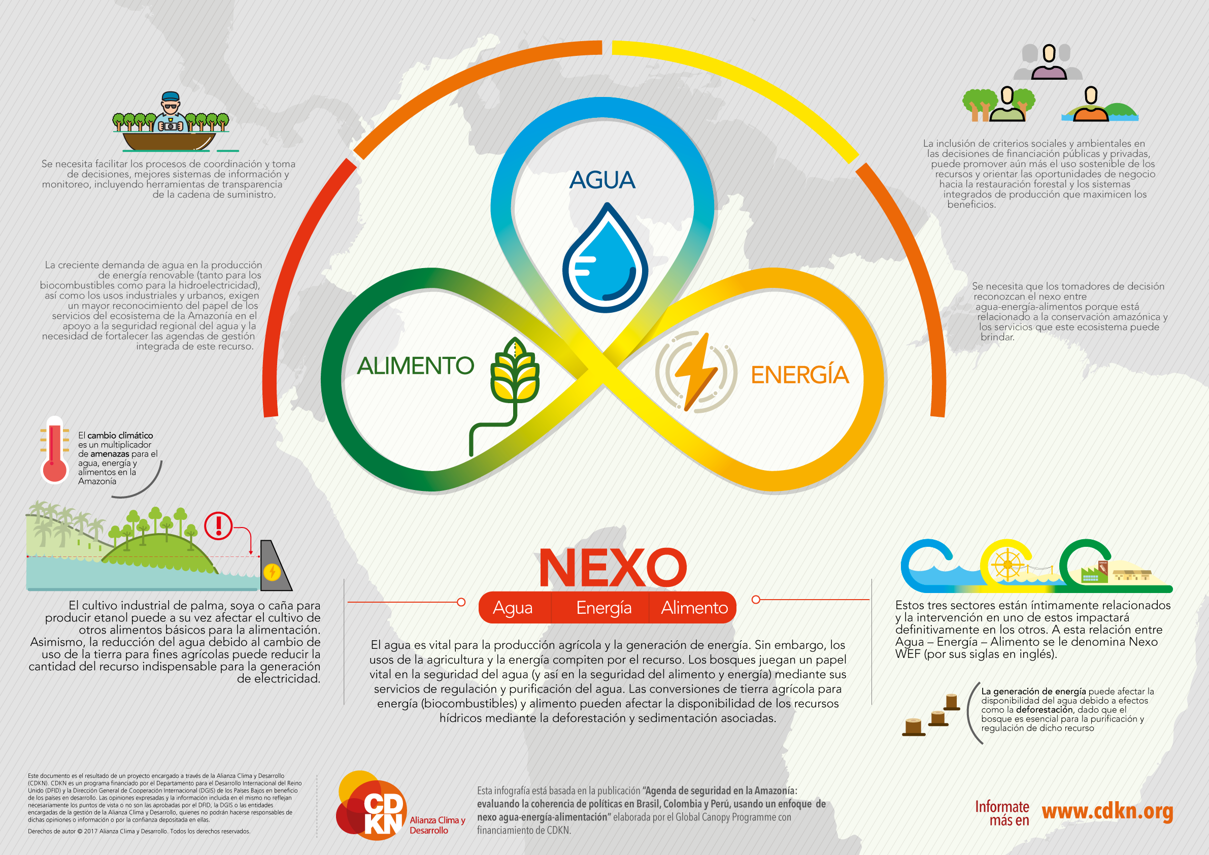 El nexo agua-energía-alimento (WEF) es un enfoque que puede apoyar a los responsables de la toma de decisión en la evaluación y representación de compensaciones de los recursos en los diferentes sectores económicos, reconociendo las interdependencias entre los sistemas hídrico, energético, alimentario y de recursos naturales
